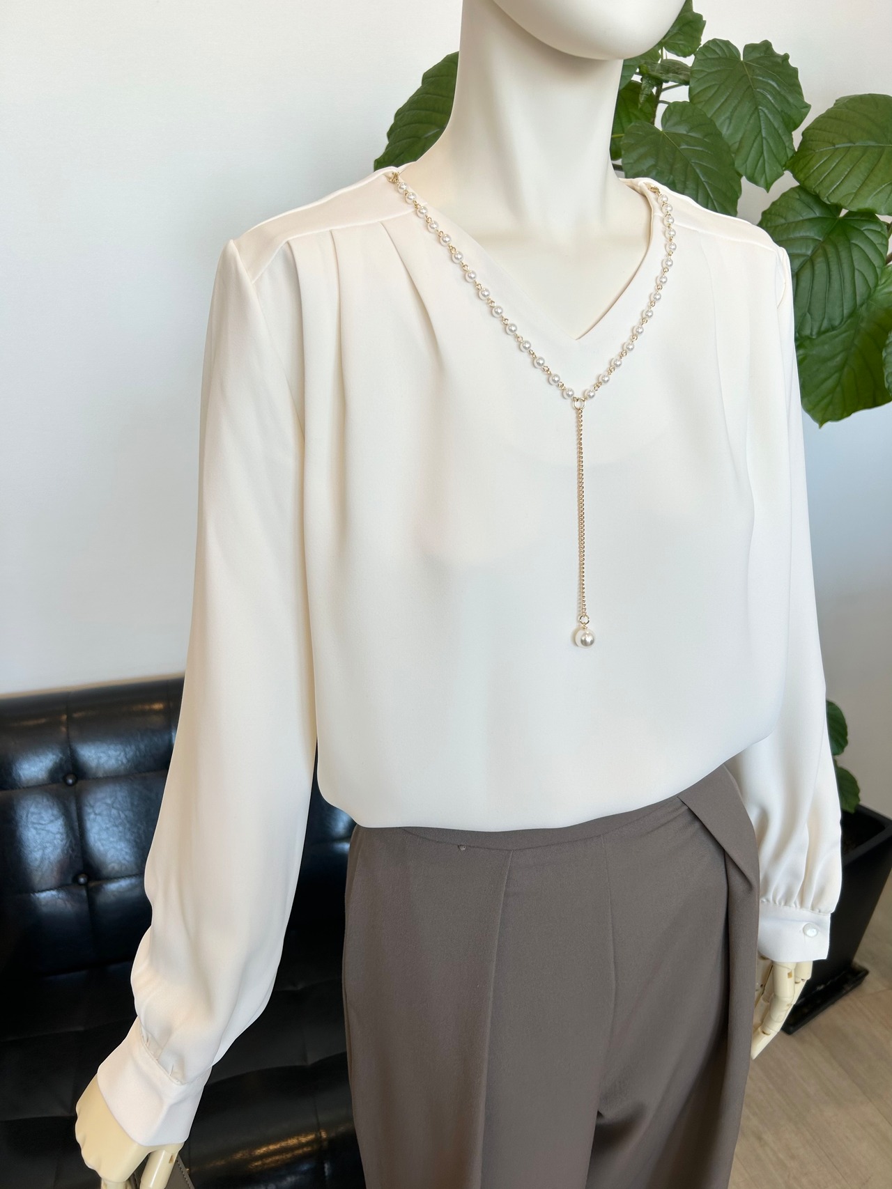 Vネックパール付ブラウス